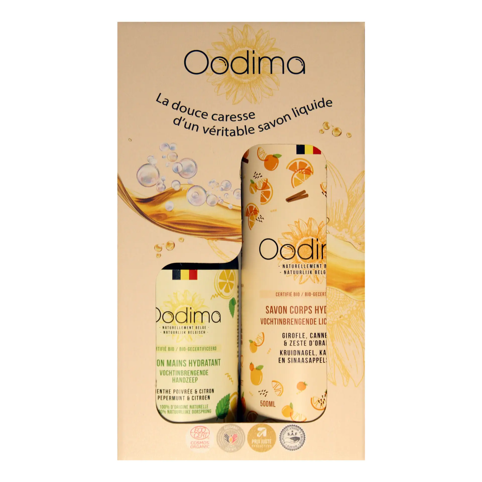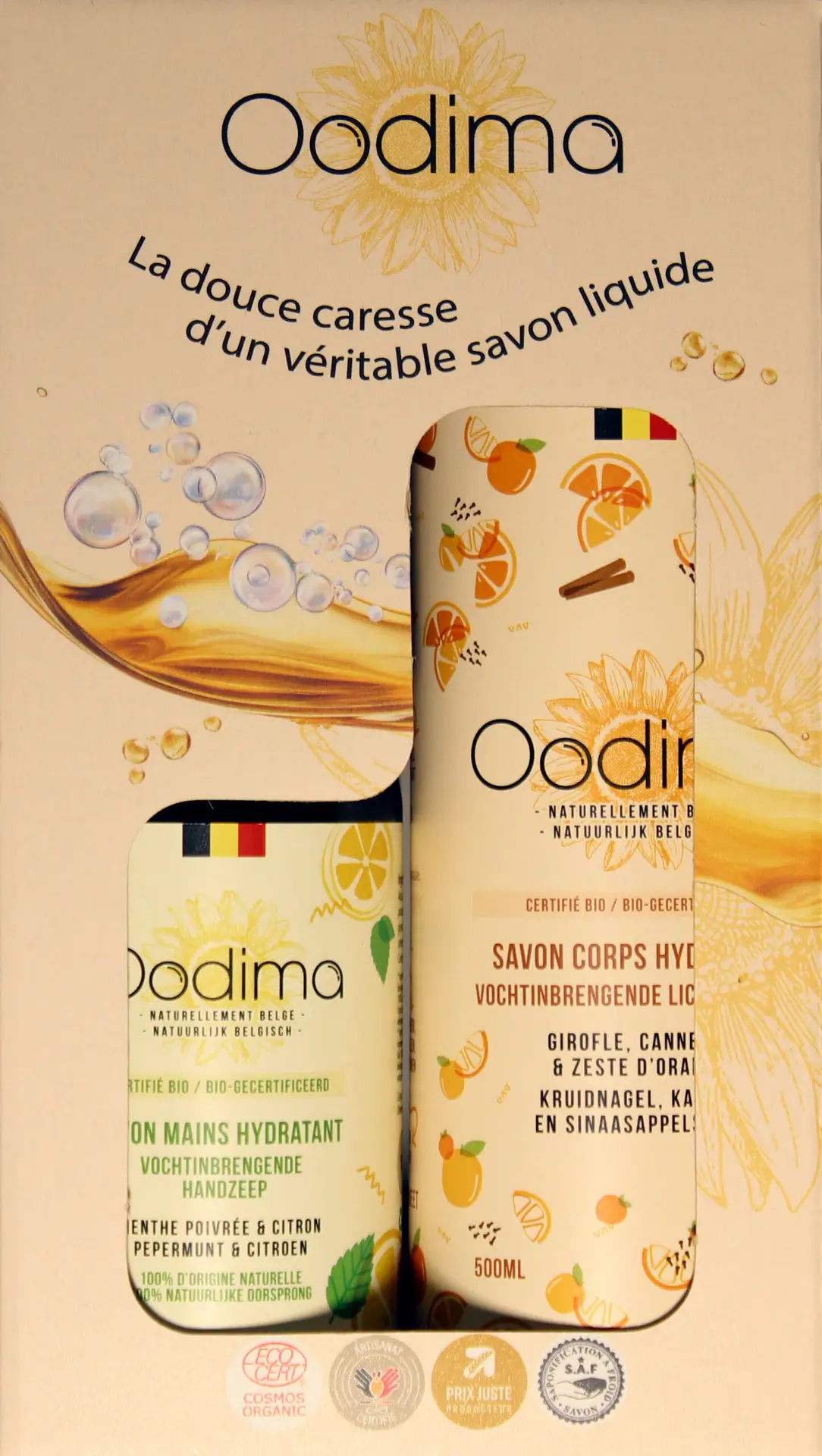 Ingrédients savon mains : Aqua, potassium sunflowerseedate (hybrid)**, potassium cocoate**, potassium castorate**, potassium hempseedate**, mineral salt, glycerin**, coco-glucoside, citric acid, citrus sinensis peel oil expressed*, pelargonium graveolens oil*, cananga odorata flower oil*. Contient du citronellol***, géraniol***, linalool***, limonène***.Ingrédients savon corps : Aqua, potassium sunflowerseedate (hybrid)**, potassium cocoate**, potassium castorate**, potassium hempseedate**, mineral salt, glycerin**, coco-glucoside, citric acid, citrus sinensis peel oil expressed*, eugenia caryophyllus clove oil*, cinnamomum zeylanicum leaf oil*. Contient du limonène*** et de l’eugénol***.* Ingrédients issus de l’agriculture biologique. ** Transformés à partir d’ingrédients biologiques. *** Naturellement présent dans les huiles essentielles.